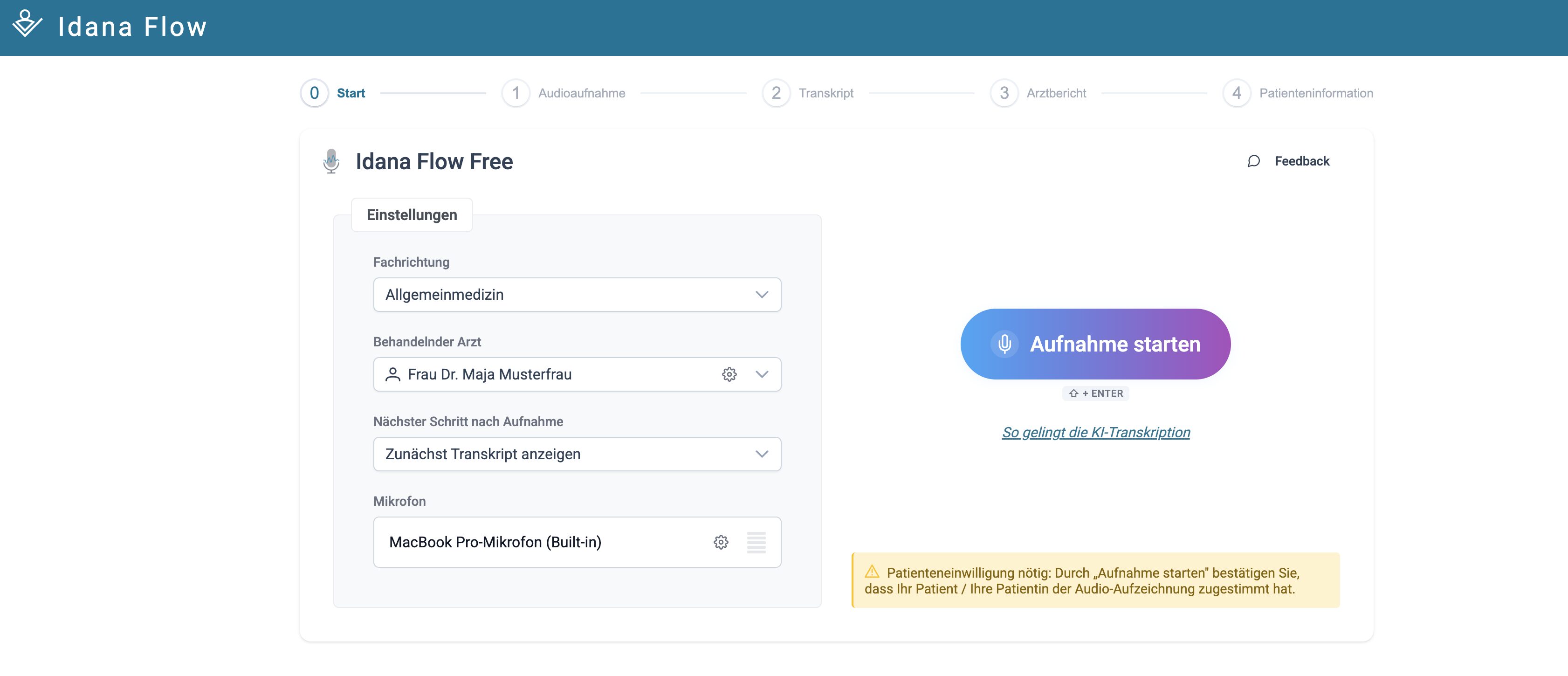 Idana Flow verwandelt Ihre Anamnesegespräche automatisch in strukturierte Arztbriefe. Kostenlos im vollen Funktionsumfang - einfach registrieren, anmelden, loslegen.